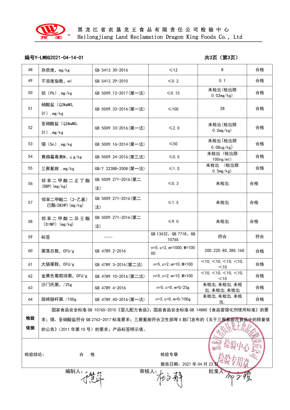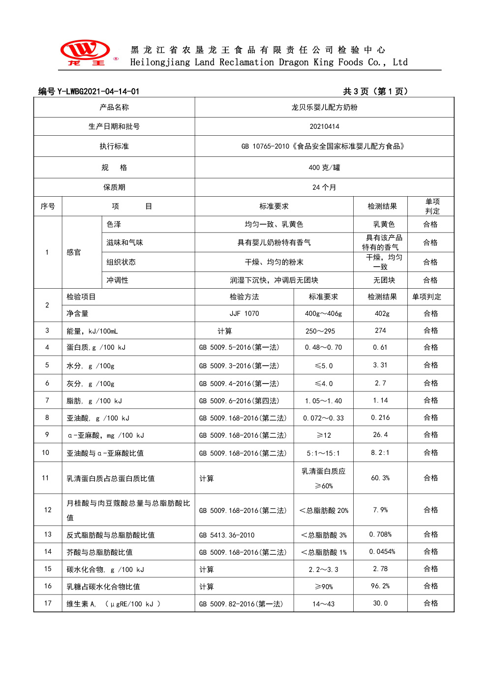 2021年(nián)4月(yuè)份龍貝樂(yuè)嬰兒(ér)配方奶粉400g
