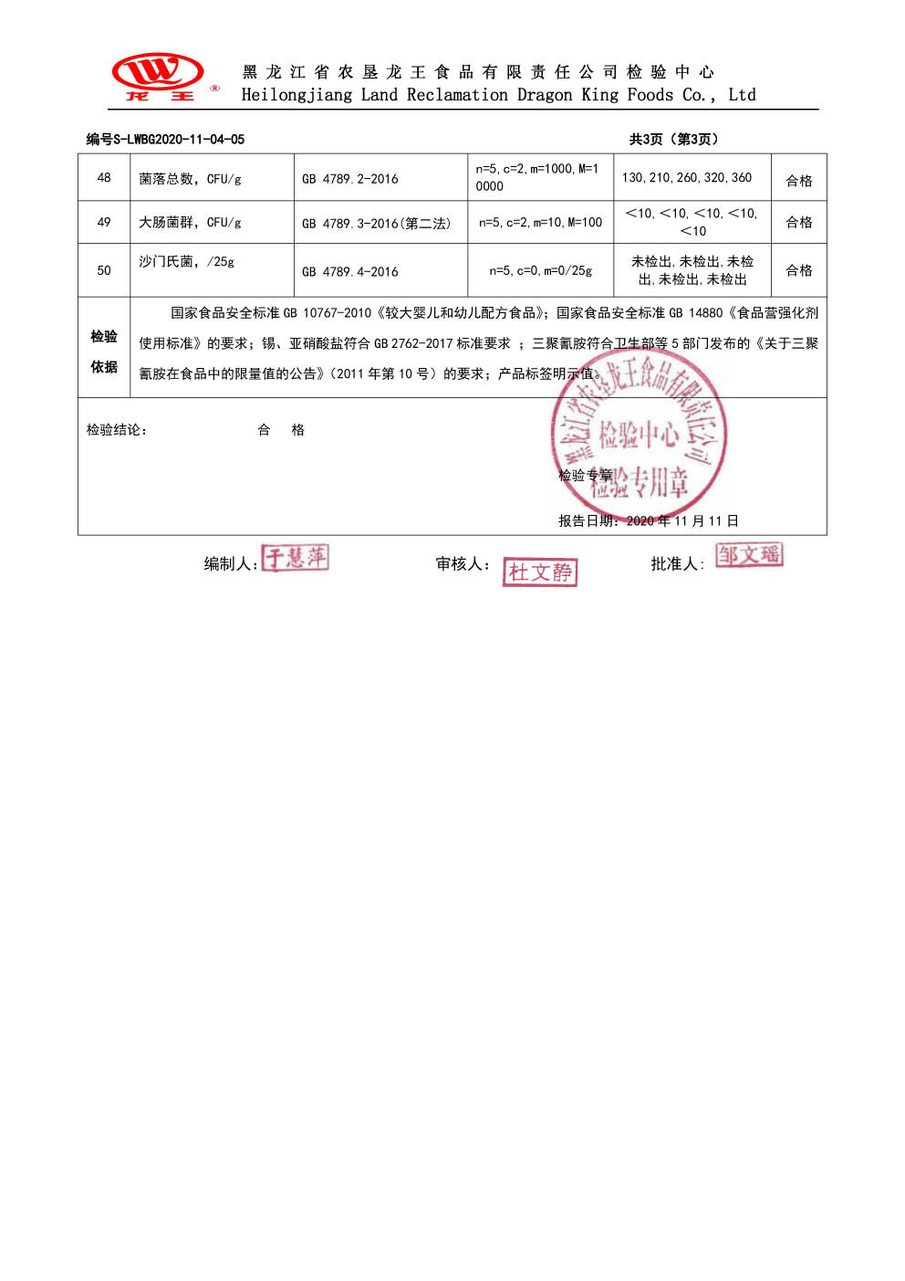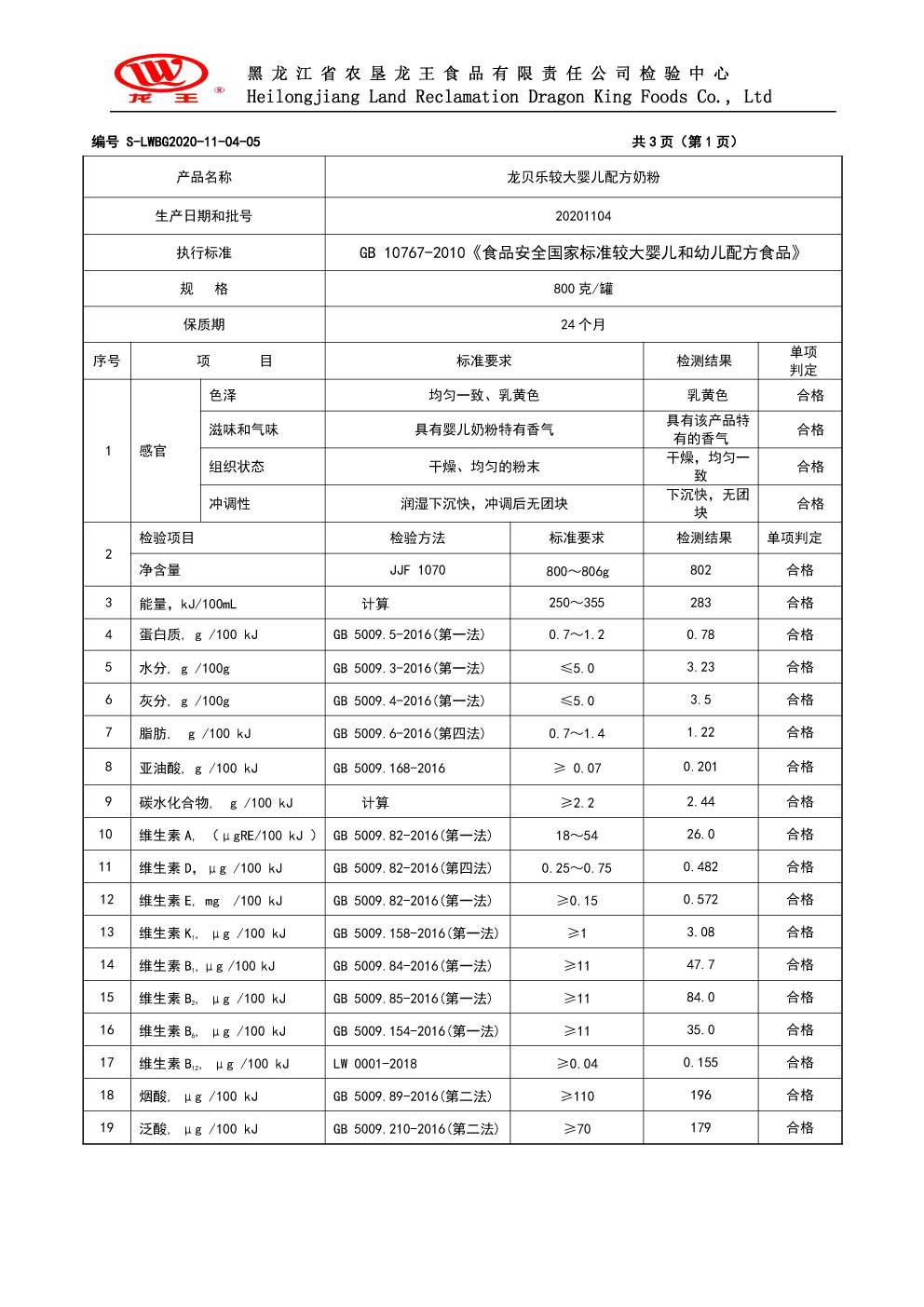 2020年(nián)11月(yuè)份龍貝樂(yuè)較大(dà)嬰兒(ér)配方奶粉800克