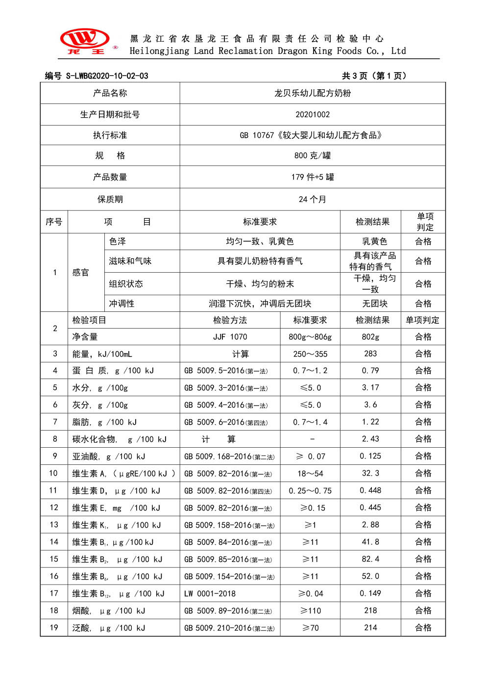 2020年(nián)10月(yuè)份龍貝樂(yuè)幼兒(ér)配方奶粉800g