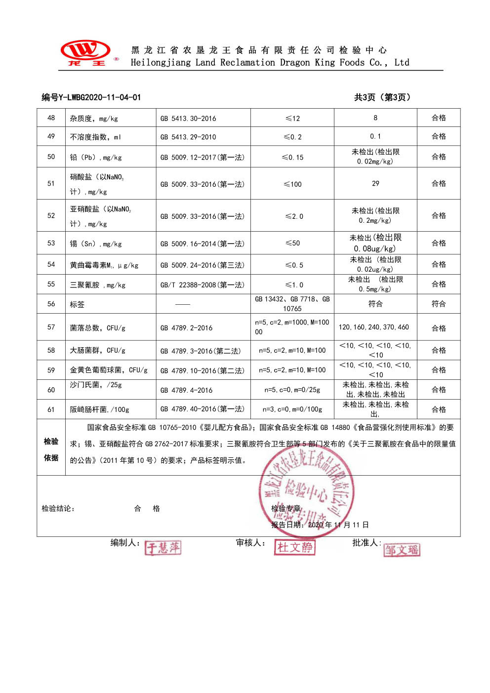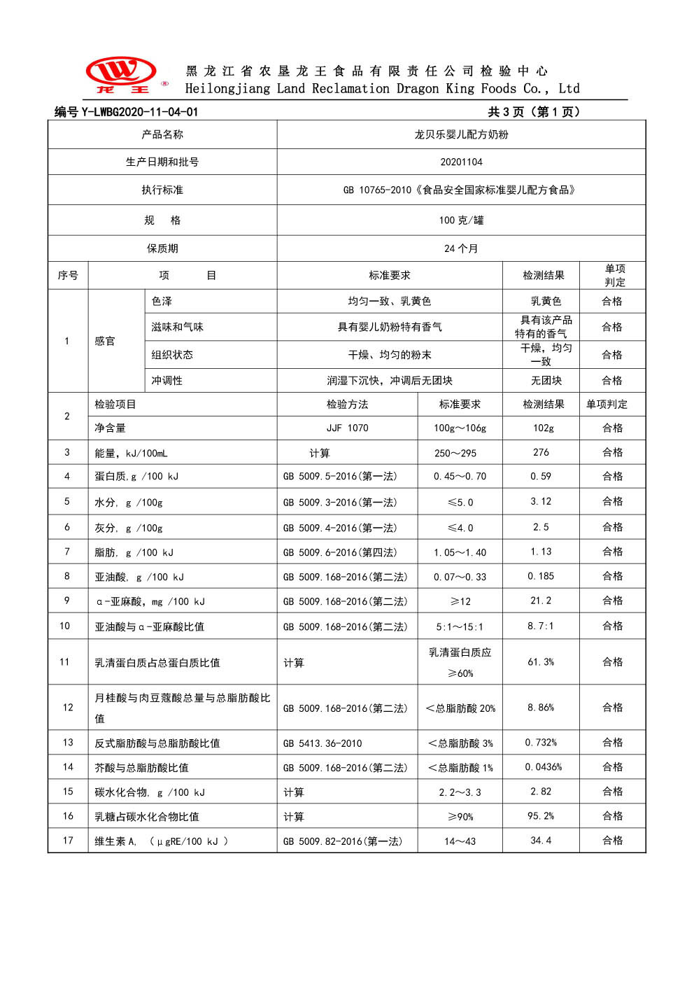 2020年(nián)11月(yuè)份龍貝樂(yuè)嬰兒(ér)配方奶粉100克