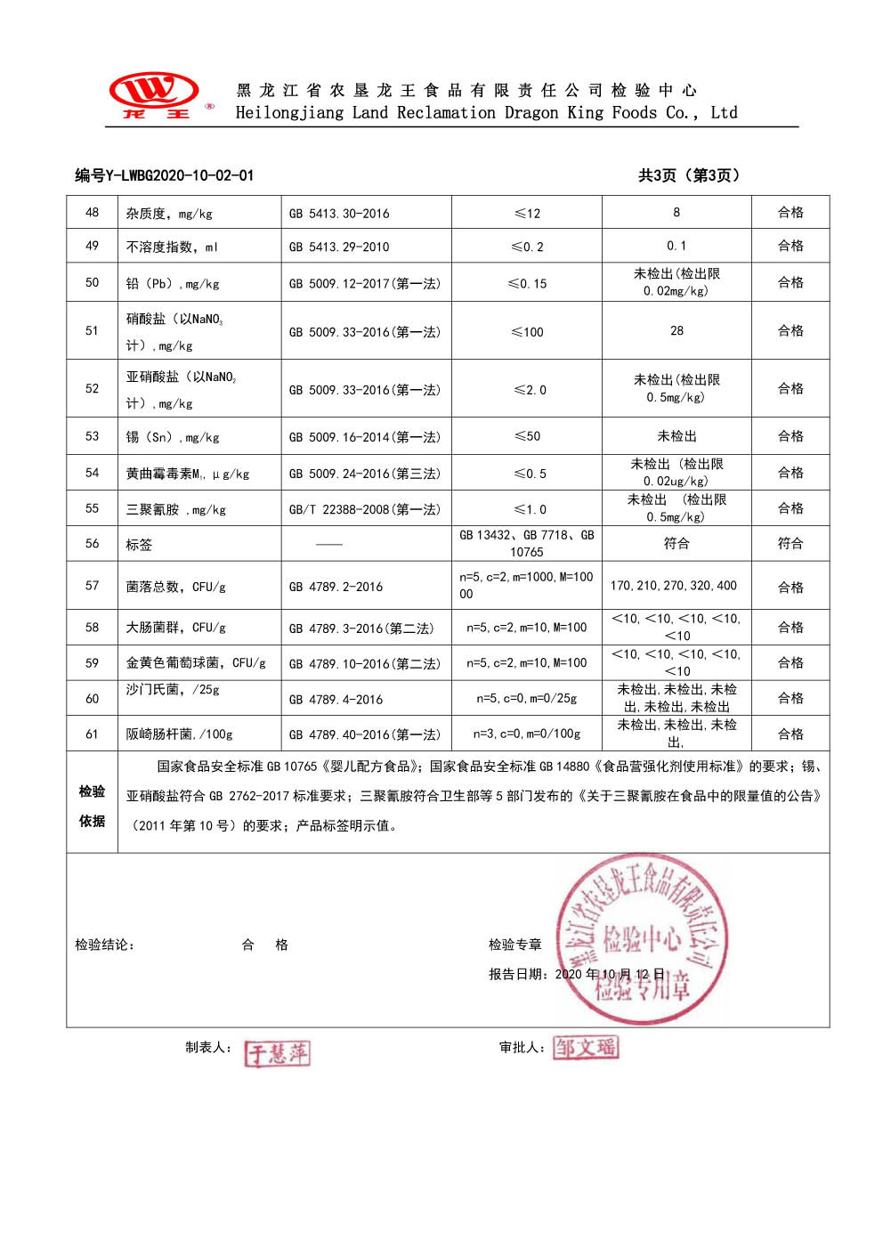 2020年(nián)10月(yuè)份龍貝樂(yuè)嬰兒(ér)配方奶粉100g