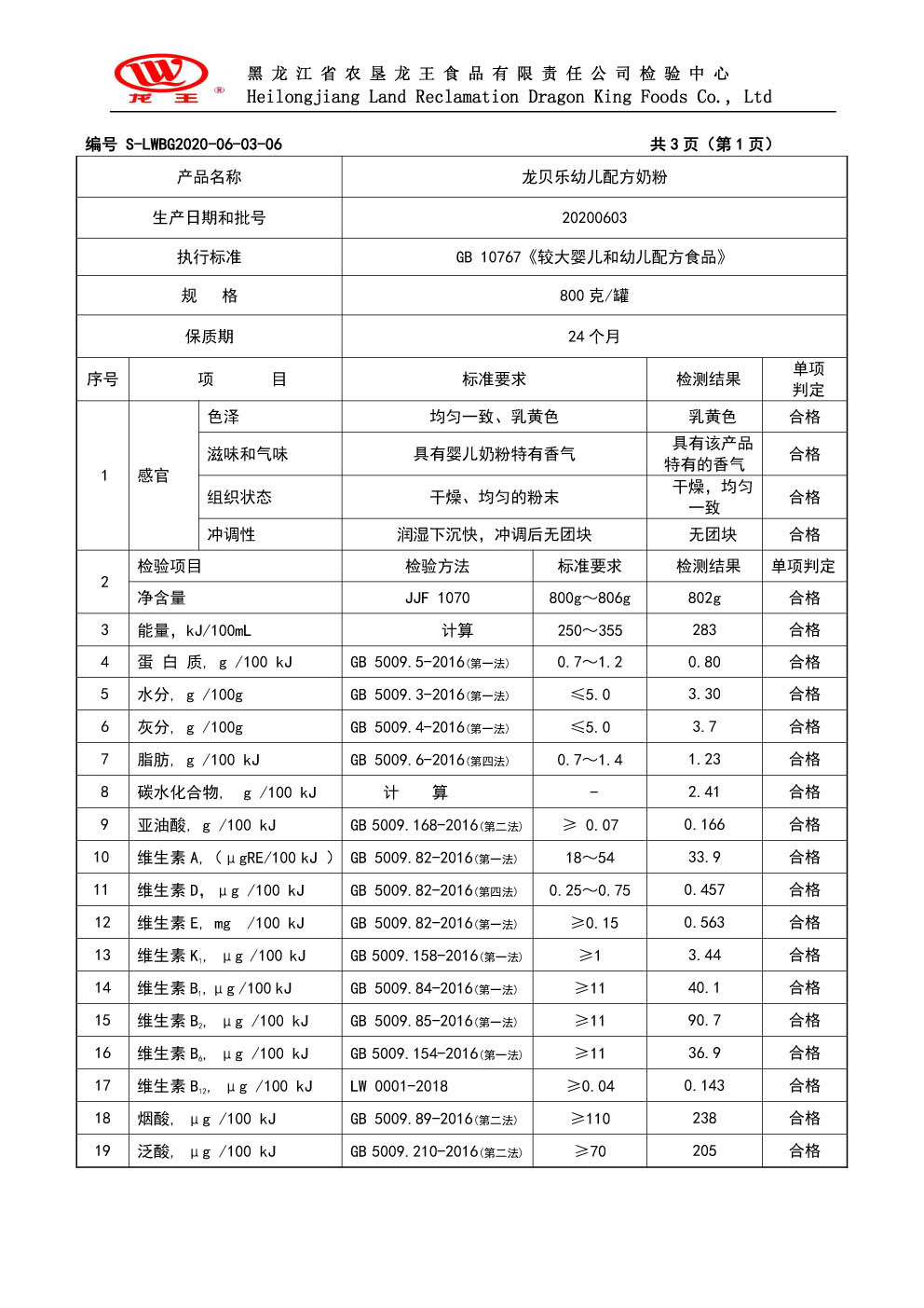 2020年(nián)6月(yuè)份龍貝樂(yuè)幼兒(ér)配方奶粉800克
