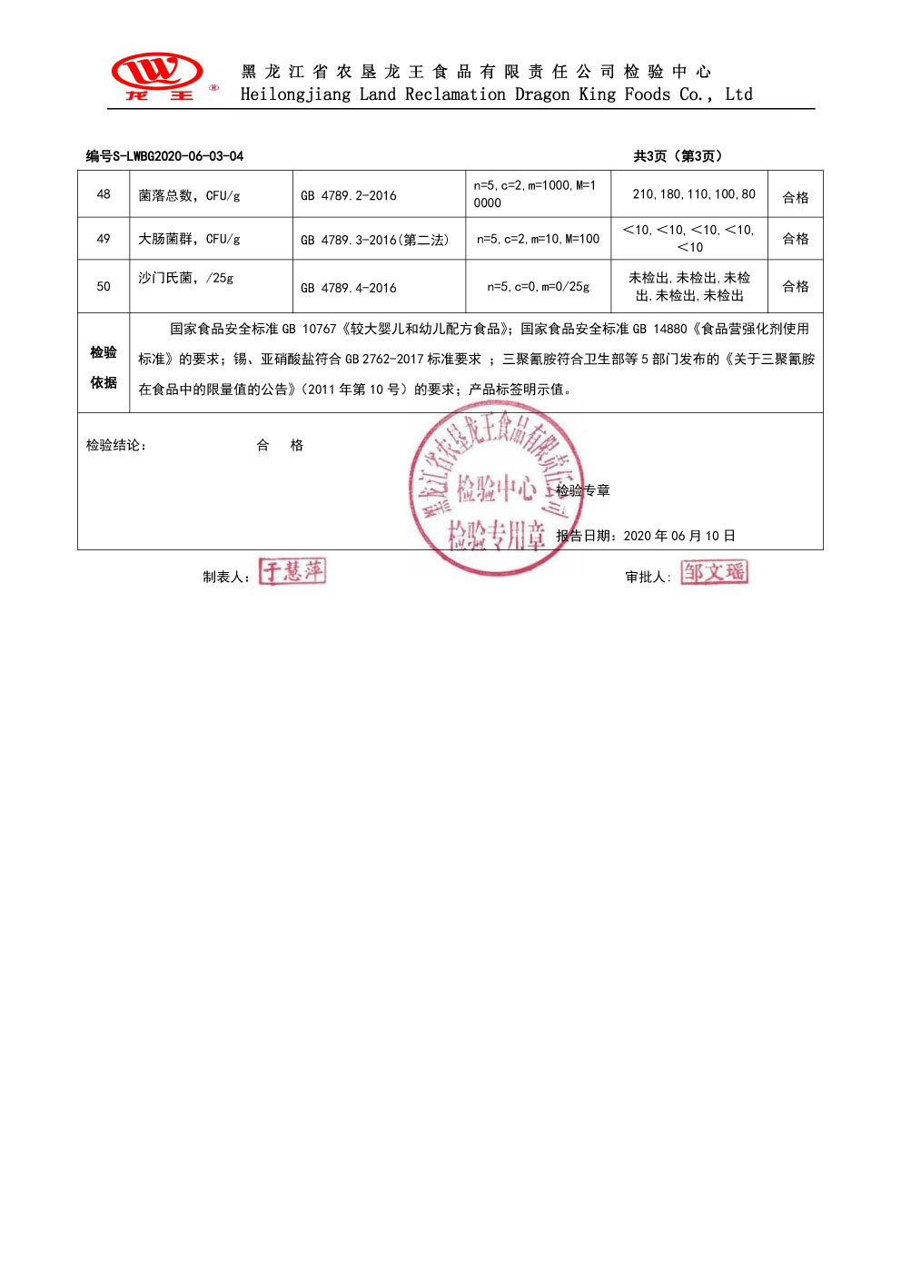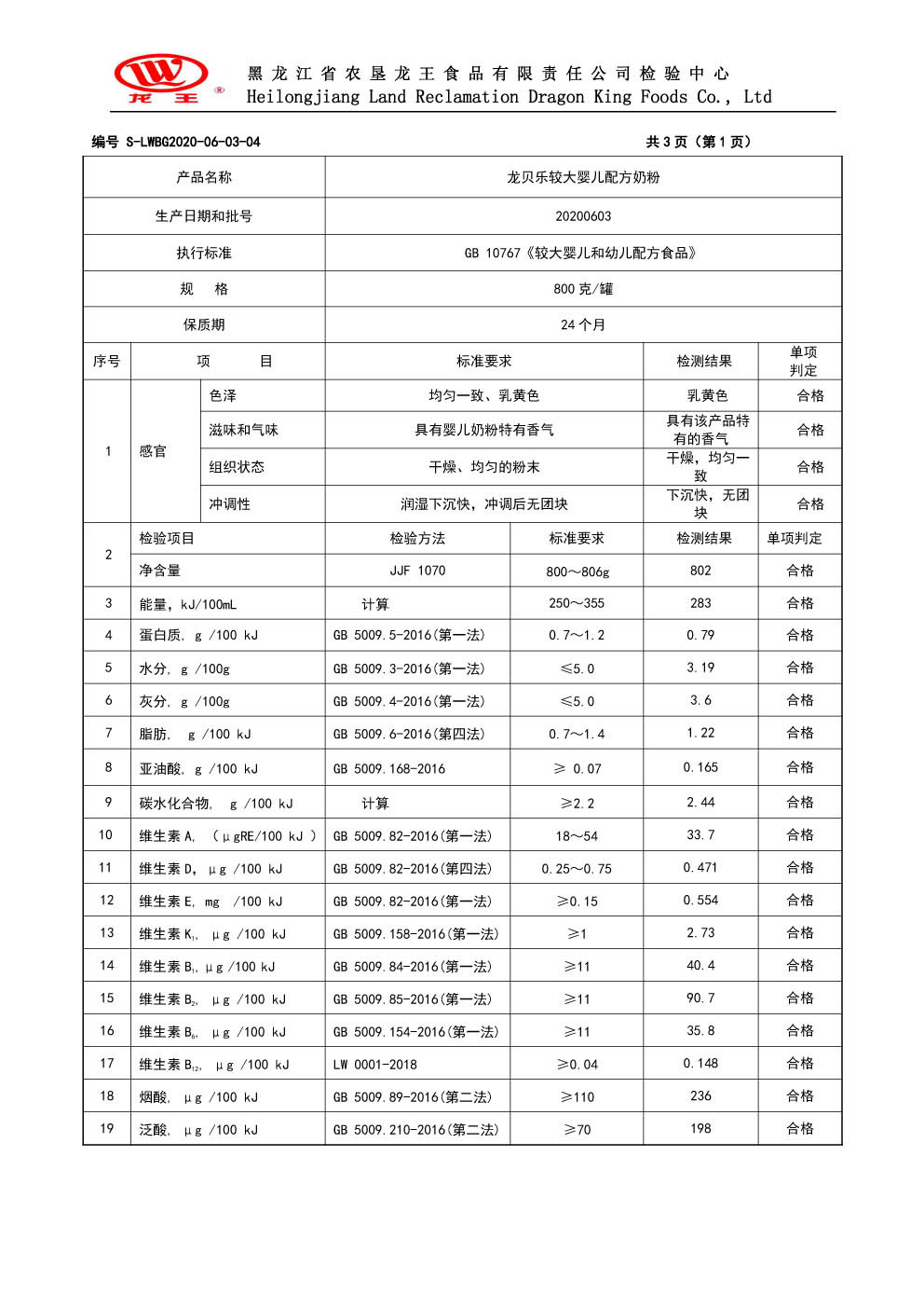 2020年(nián)6月(yuè)份龍貝樂(yuè)較大(dà)嬰兒(ér)配方奶粉800克