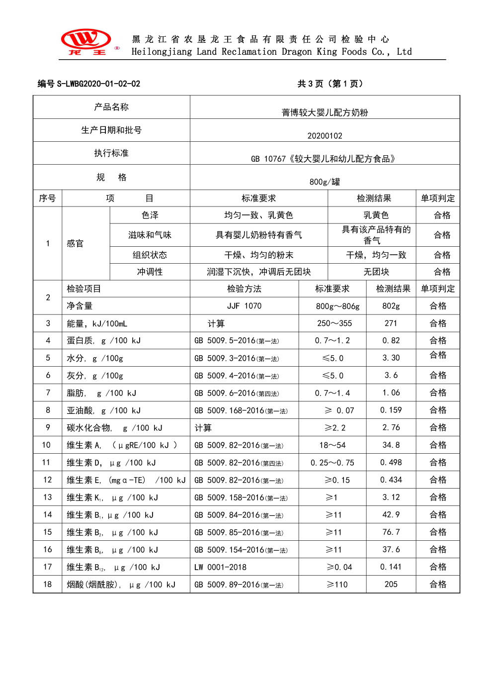 2020年(nián)01月(yuè)份菁博較大(dà)嬰兒(ér)配方奶粉800克