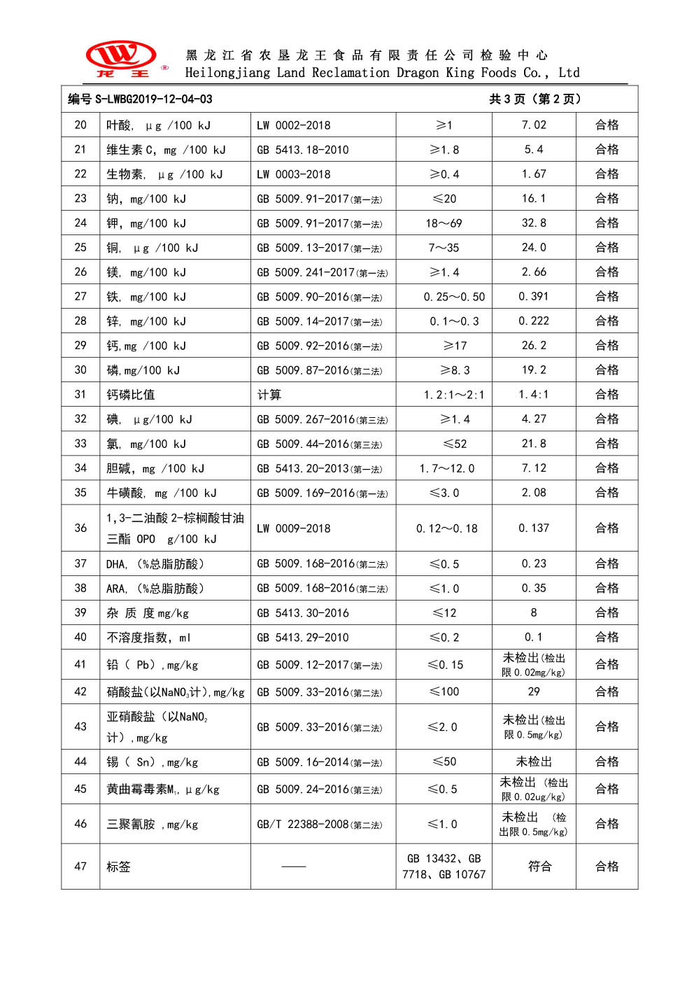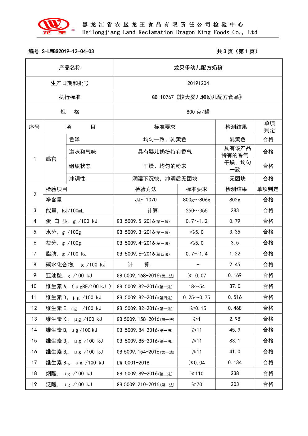 2019年(nián)12月(yuè)份龍貝樂(yuè)幼兒(ér)配方奶粉800克