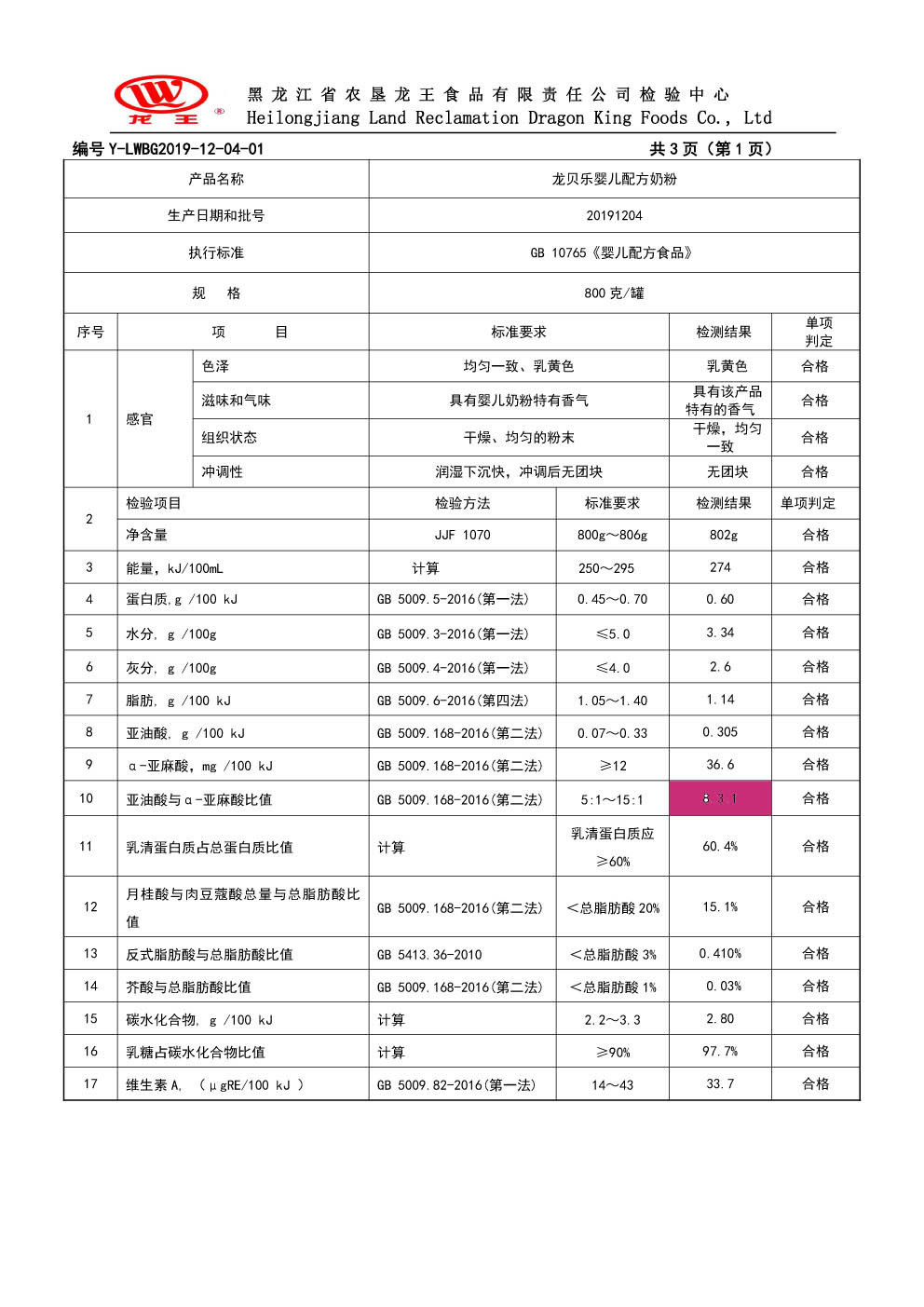 2019年(nián)12月(yuè)份龍貝樂(yuè)嬰兒(ér)配方奶粉800克