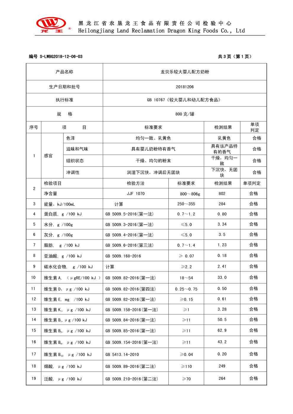 2018年(nián)12月(yuè)份龍貝樂(yuè)較大(dà)嬰兒(ér)配方奶粉800克