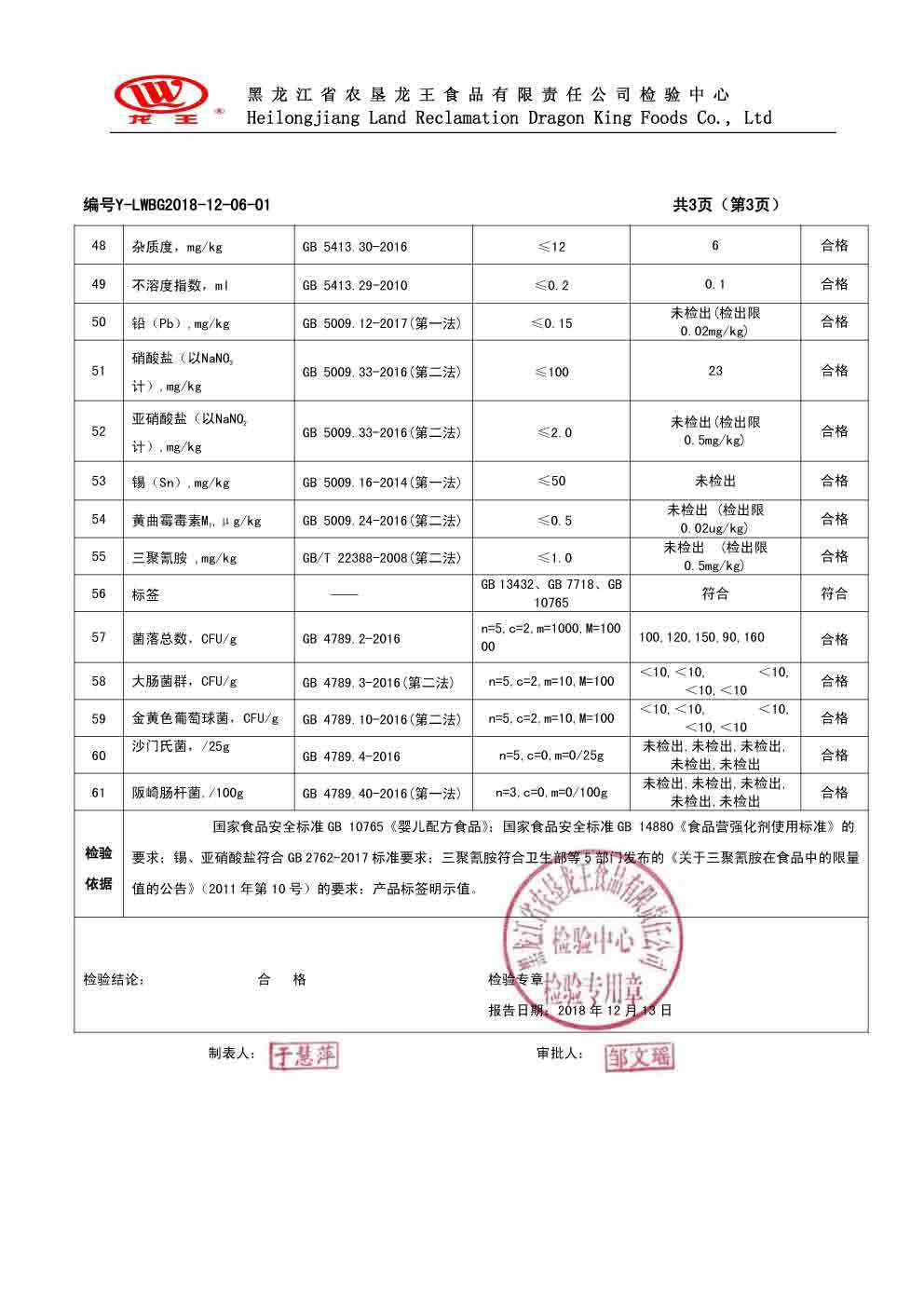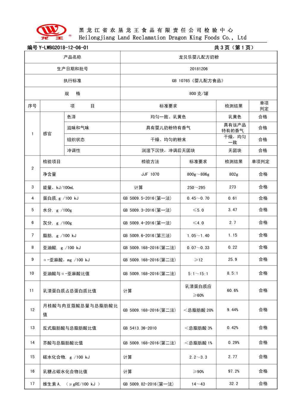 2018年(nián)12月(yuè)份龍貝樂(yuè)嬰兒(ér)配方奶粉800克