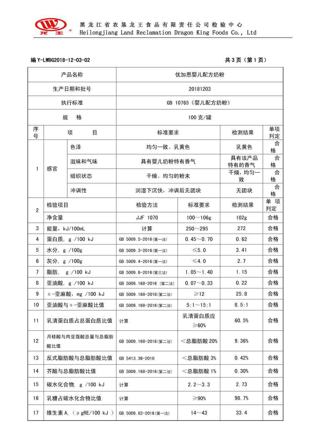 2018年(nián)12月(yuè)份優加恩嬰兒(ér)配方奶粉100克
