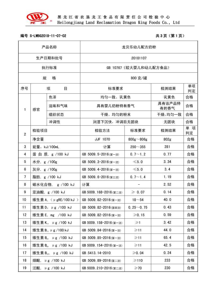 2018年(nián)11月(yuè)份龍貝樂(yuè)幼兒(ér)配方奶粉800克