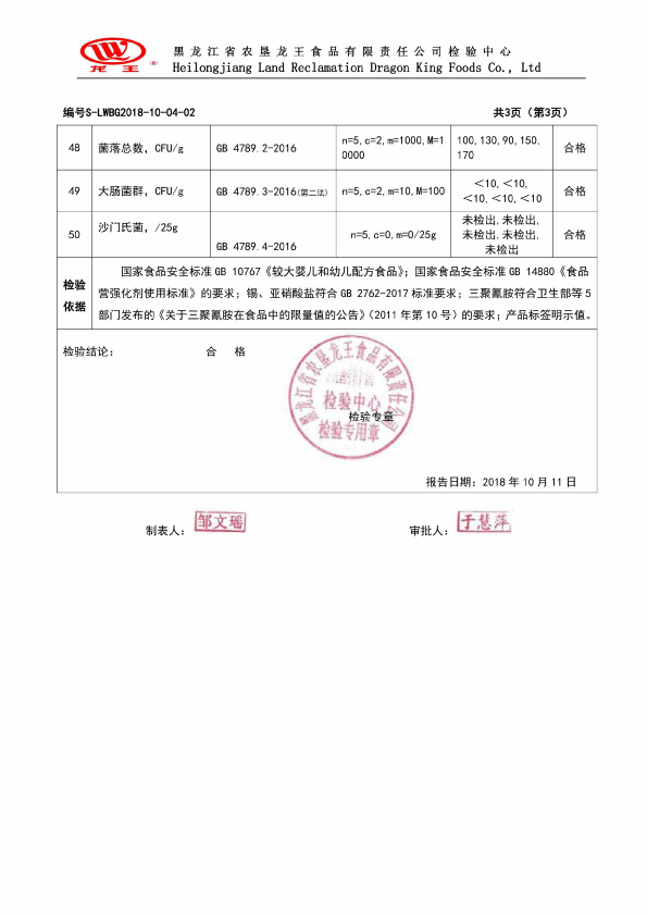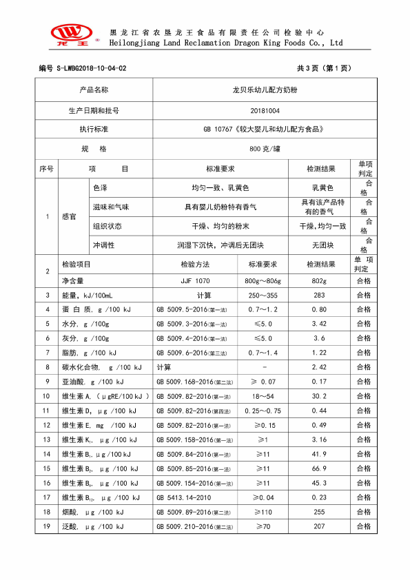 2018年(nián)10月(yuè)份龍貝樂(yuè)幼兒(ér)配方奶粉800克