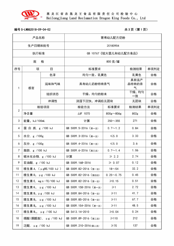 2018年(nián)9月(yuè)份菁博幼兒(ér)配方奶粉800克
