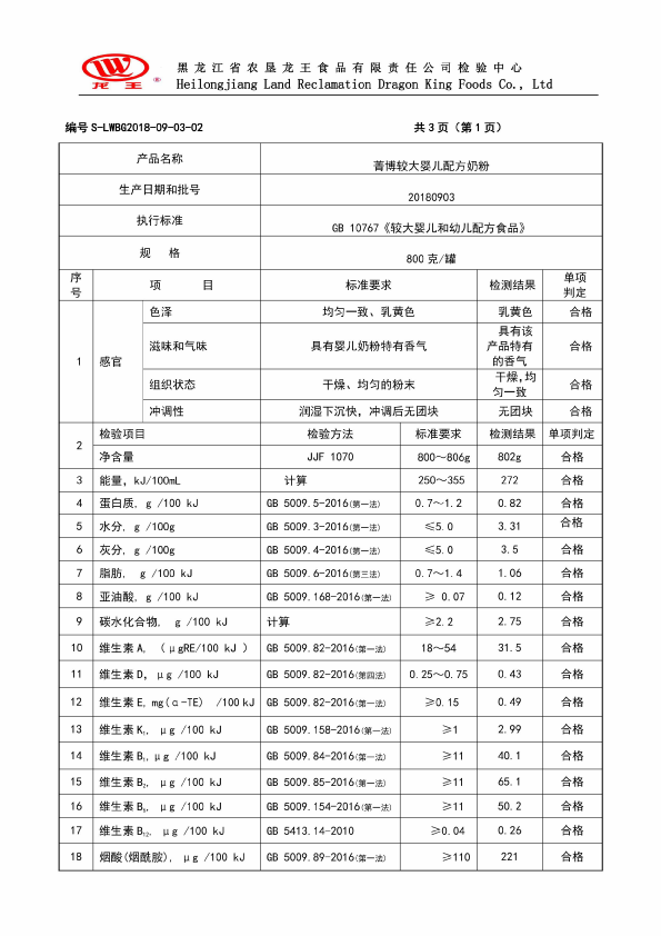 2018年(nián)9月(yuè)份菁博較大(dà)嬰兒(ér)配方奶粉800克