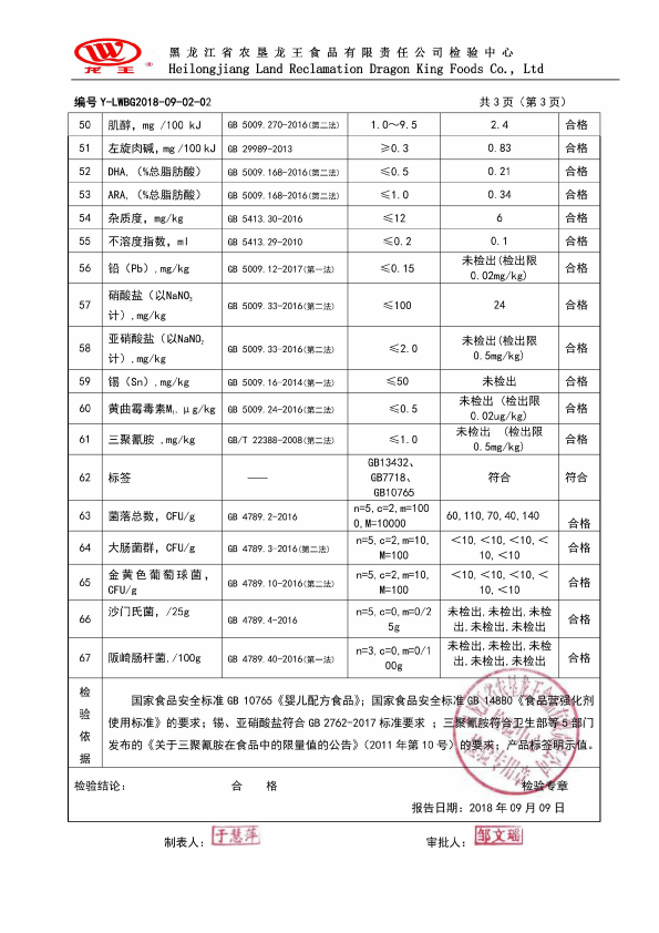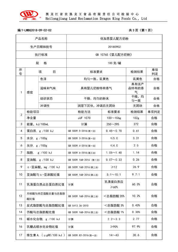 2018年(nián)9月(yuè)份優加恩嬰兒(ér)配方奶粉100克