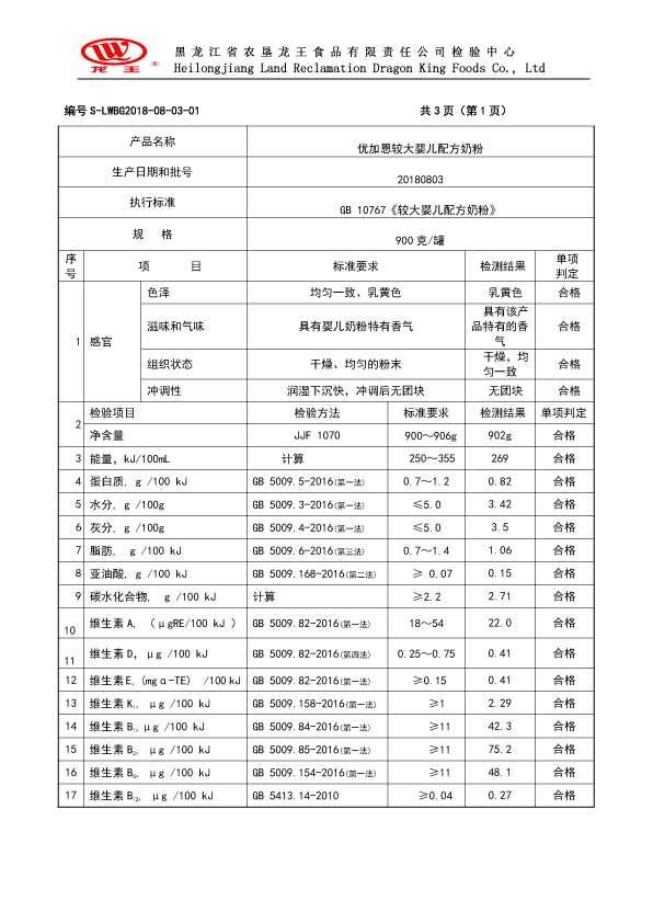 2018年(nián)8月(yuè)份優加恩較大(dà)嬰兒(ér)配方奶粉900克