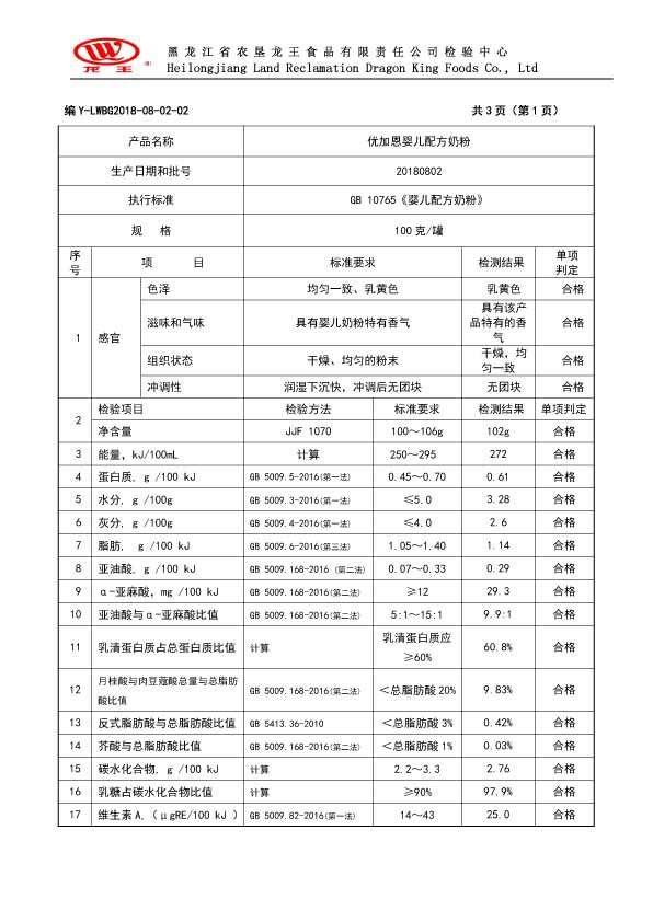 2018年(nián)8月(yuè)份優加恩嬰兒(ér)配方奶粉100克