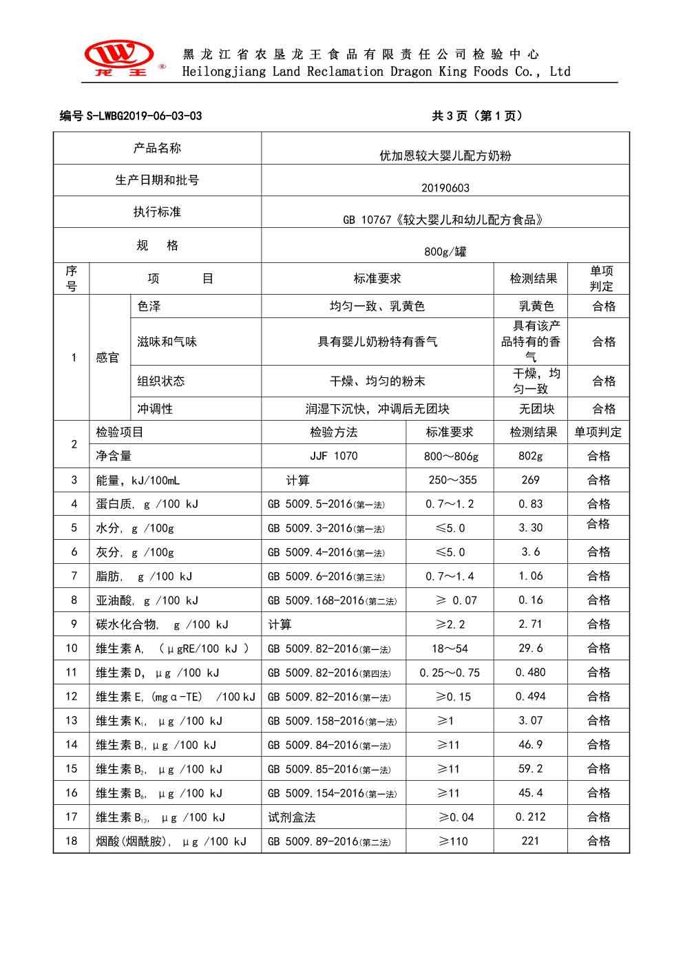 2019年(nián)6月(yuè)份優加恩較大(dà)嬰兒(ér)配方奶粉800克