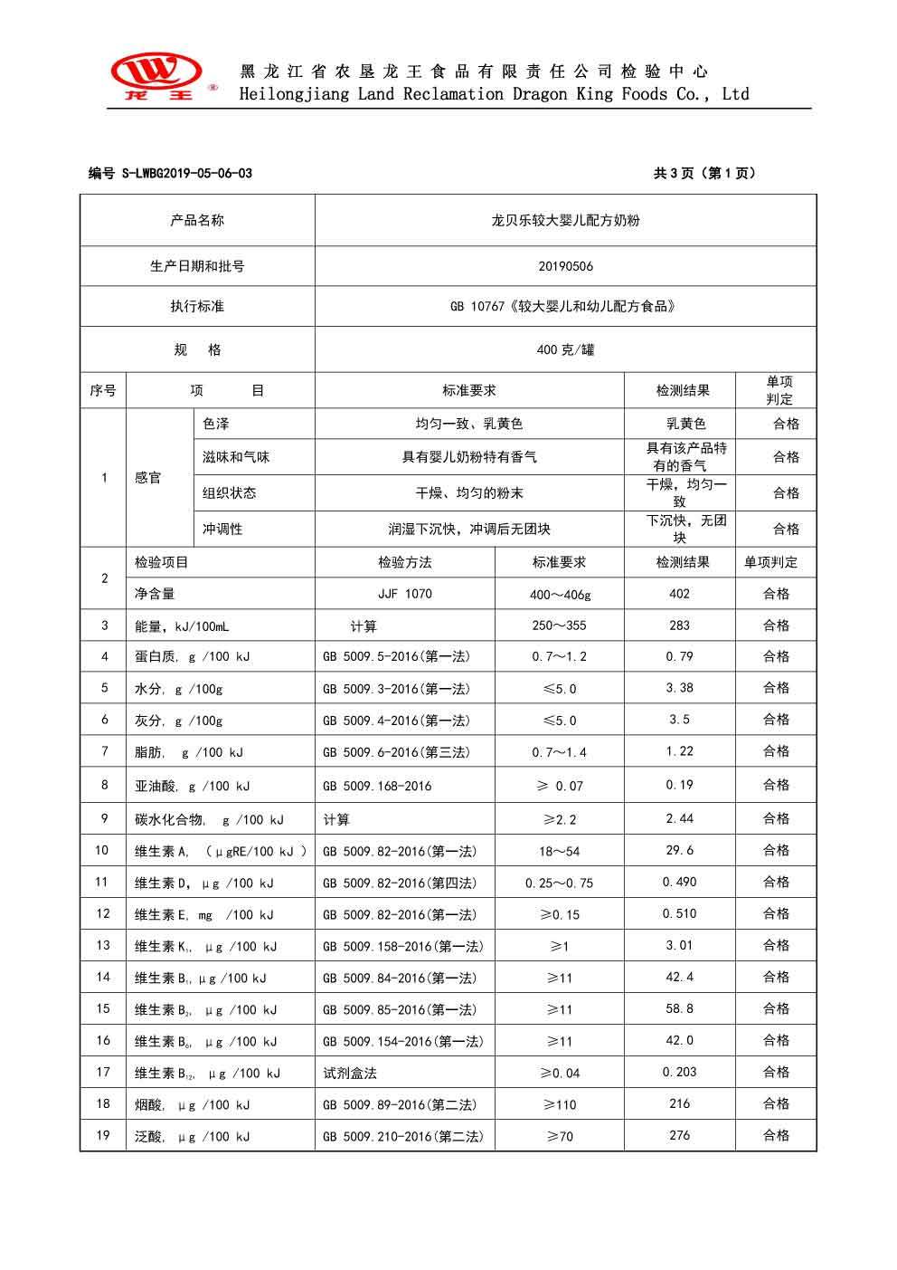 2019年(nián)5月(yuè)份龍貝樂(yuè)較大(dà)嬰兒(ér)配方奶粉400克