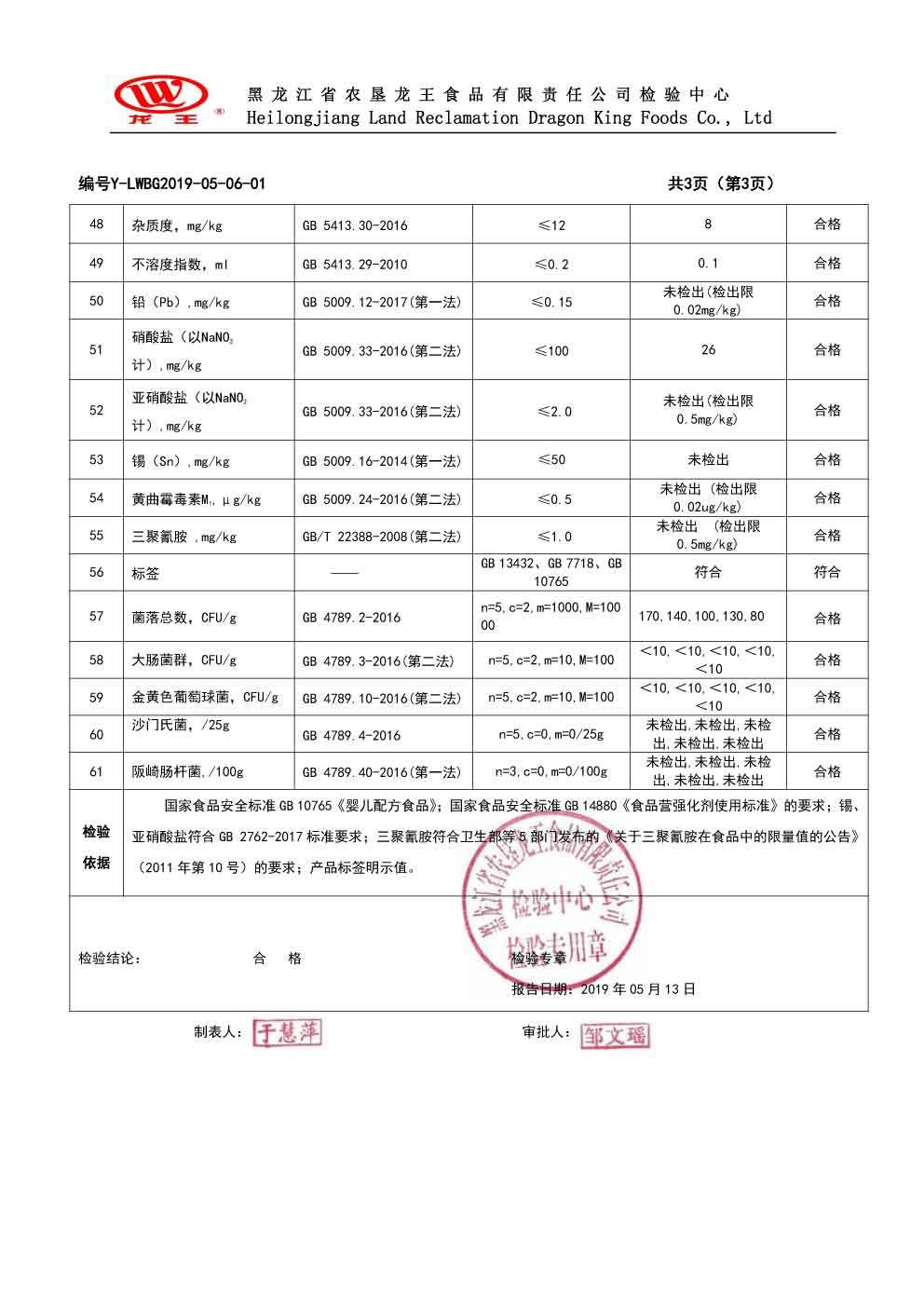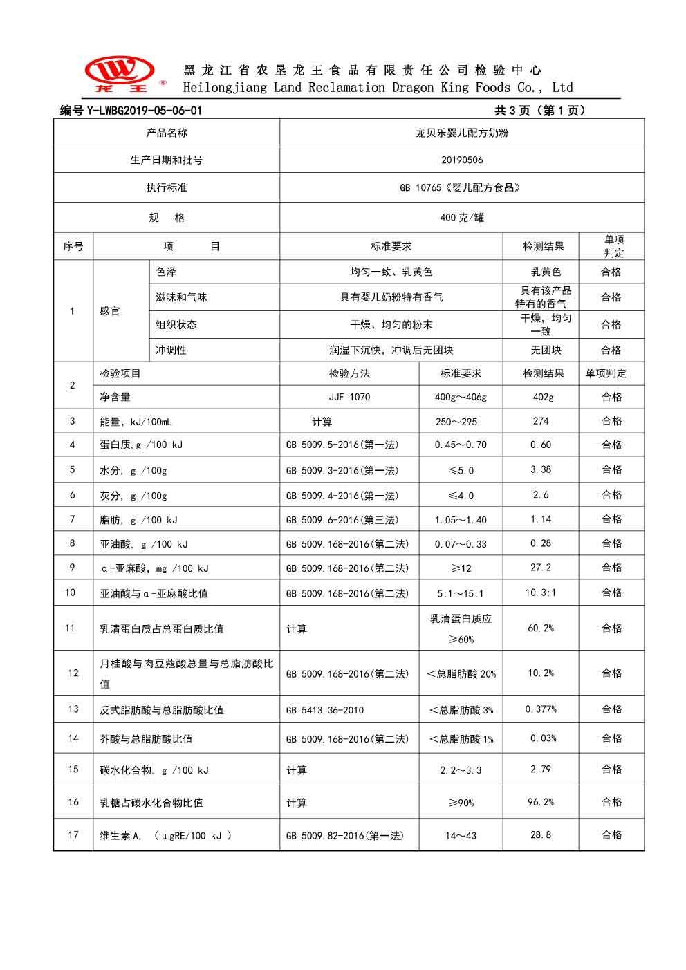 2019年(nián)5月(yuè)份龍貝樂(yuè)嬰兒(ér)配方奶粉400克