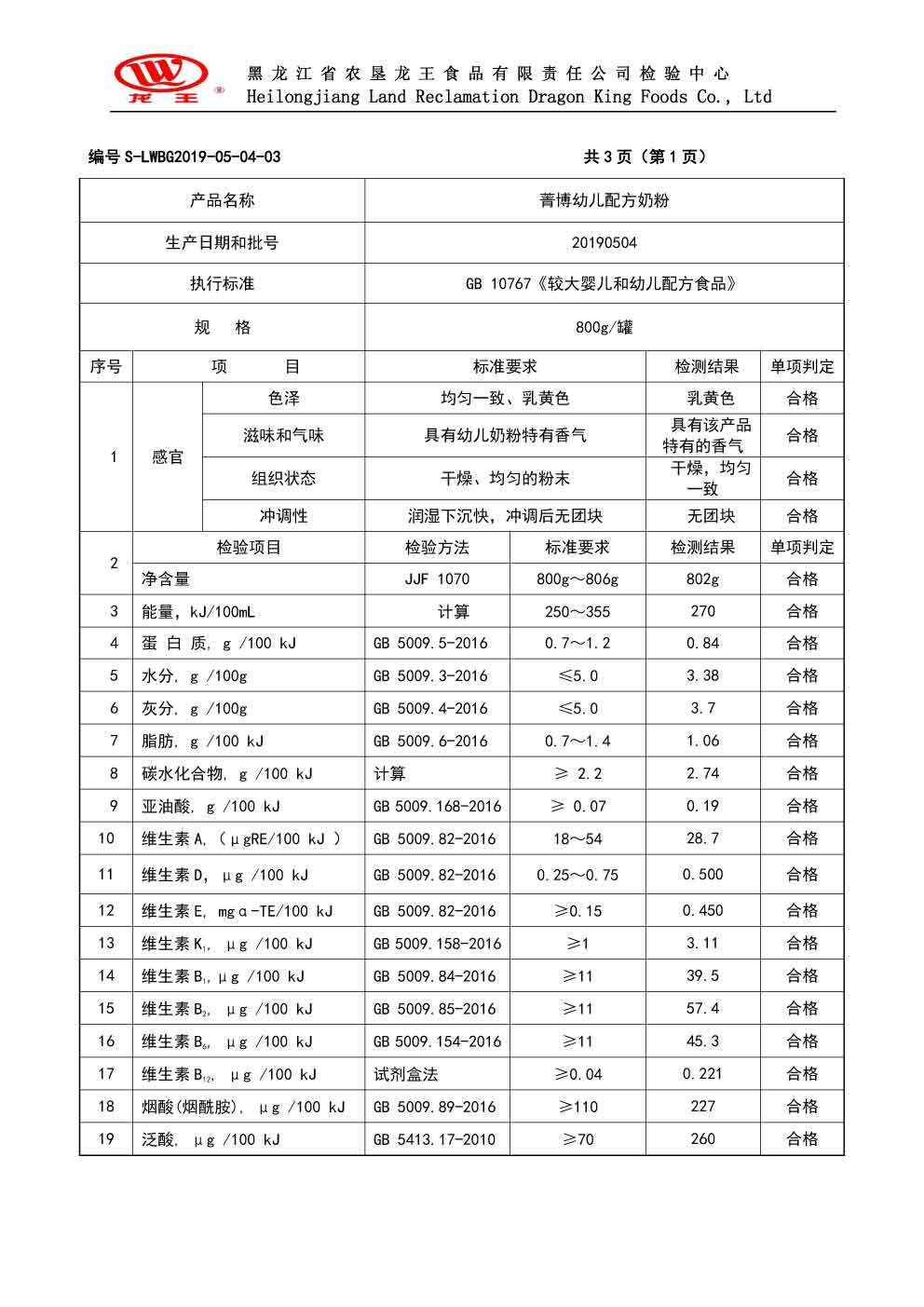 2019年(nián)5月(yuè)份菁博幼兒(ér)配方奶粉800克