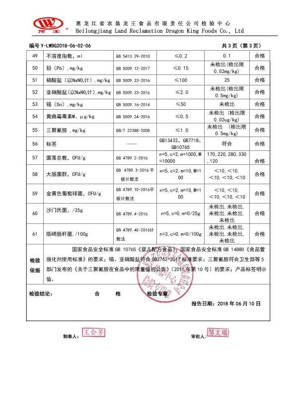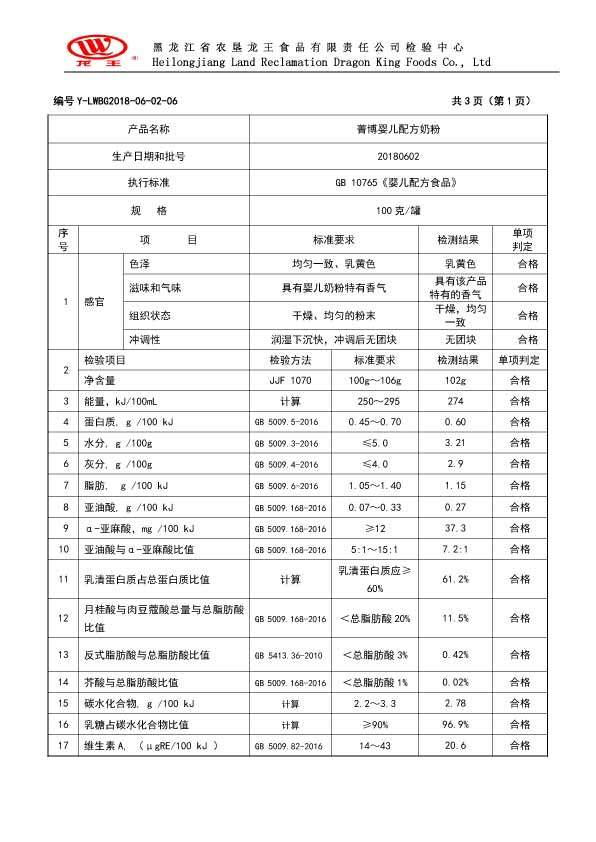 2018年(nián)6月(yuè)份菁博嬰兒(ér)配方奶粉100克