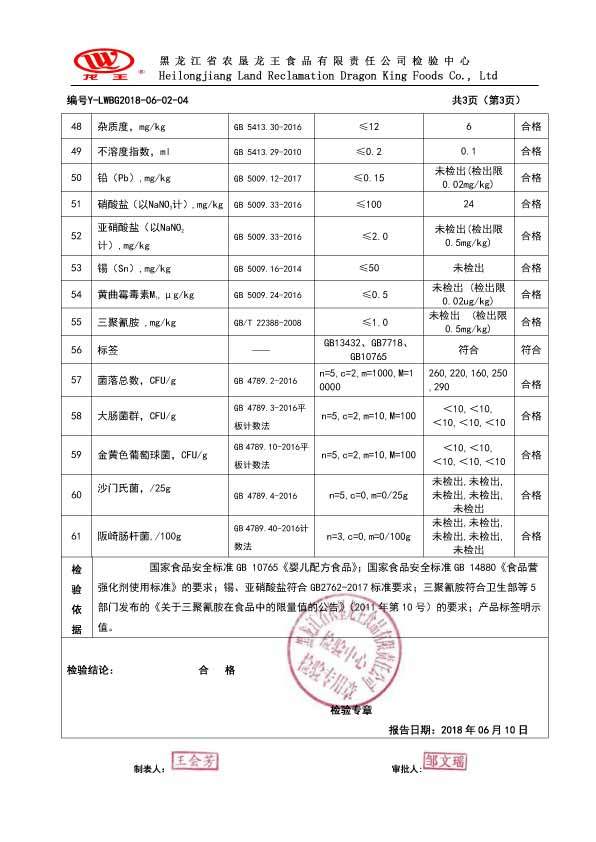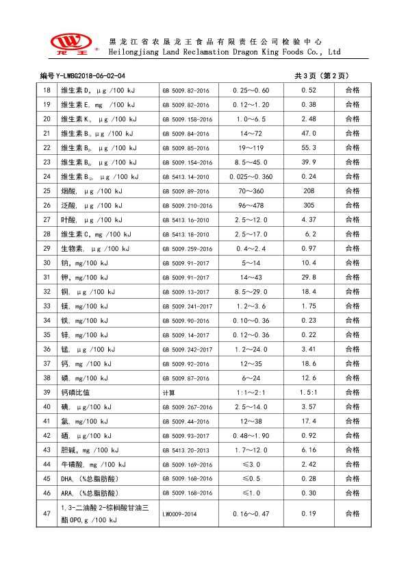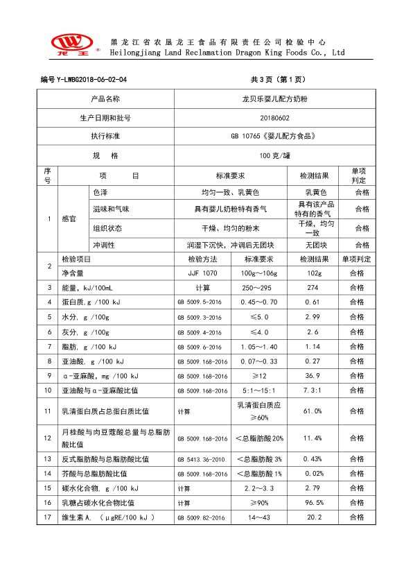 2018年(nián)6月(yuè)份龍貝樂(yuè)嬰兒(ér)配方奶粉100克