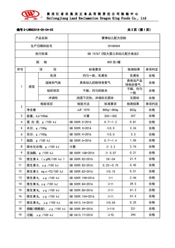 2018年(nián)5月(yuè)份菁博幼兒(ér)配方奶粉800克