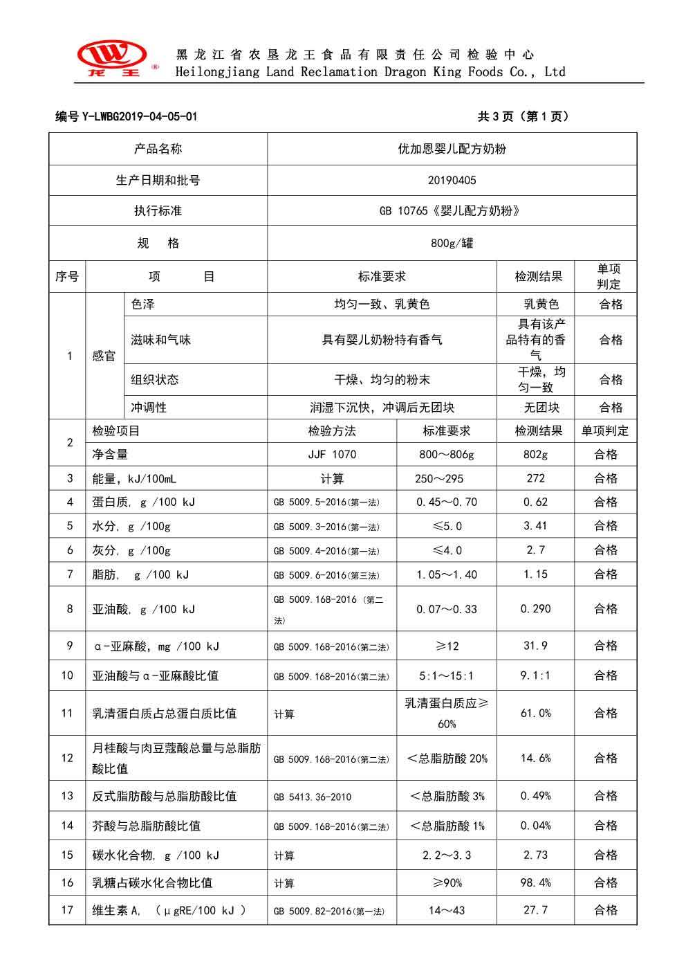 2019年(nián)4月(yuè)份優加恩嬰兒(ér)配方奶粉800克