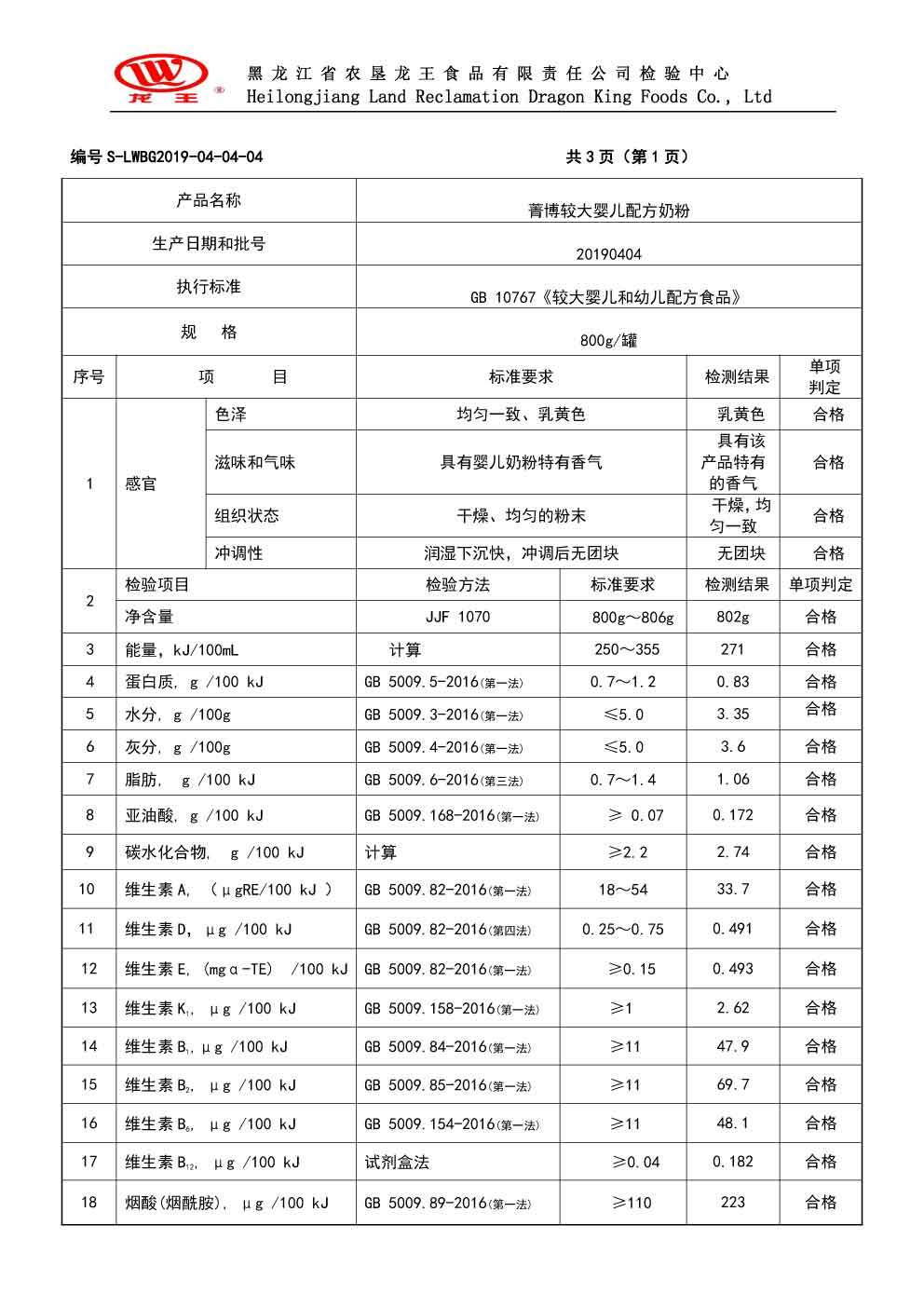 2019年(nián)4月(yuè)份菁博較大(dà)嬰兒(ér)配方奶粉800克