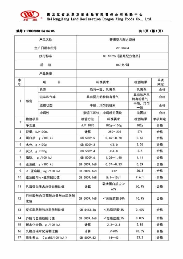 2018年(nián)4月(yuè)份菁博嬰兒(ér)配方奶粉100克