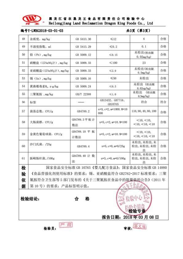 2018年(nián)3月(yuè)份龍貝樂(yuè)嬰兒(ér)配方奶粉800克