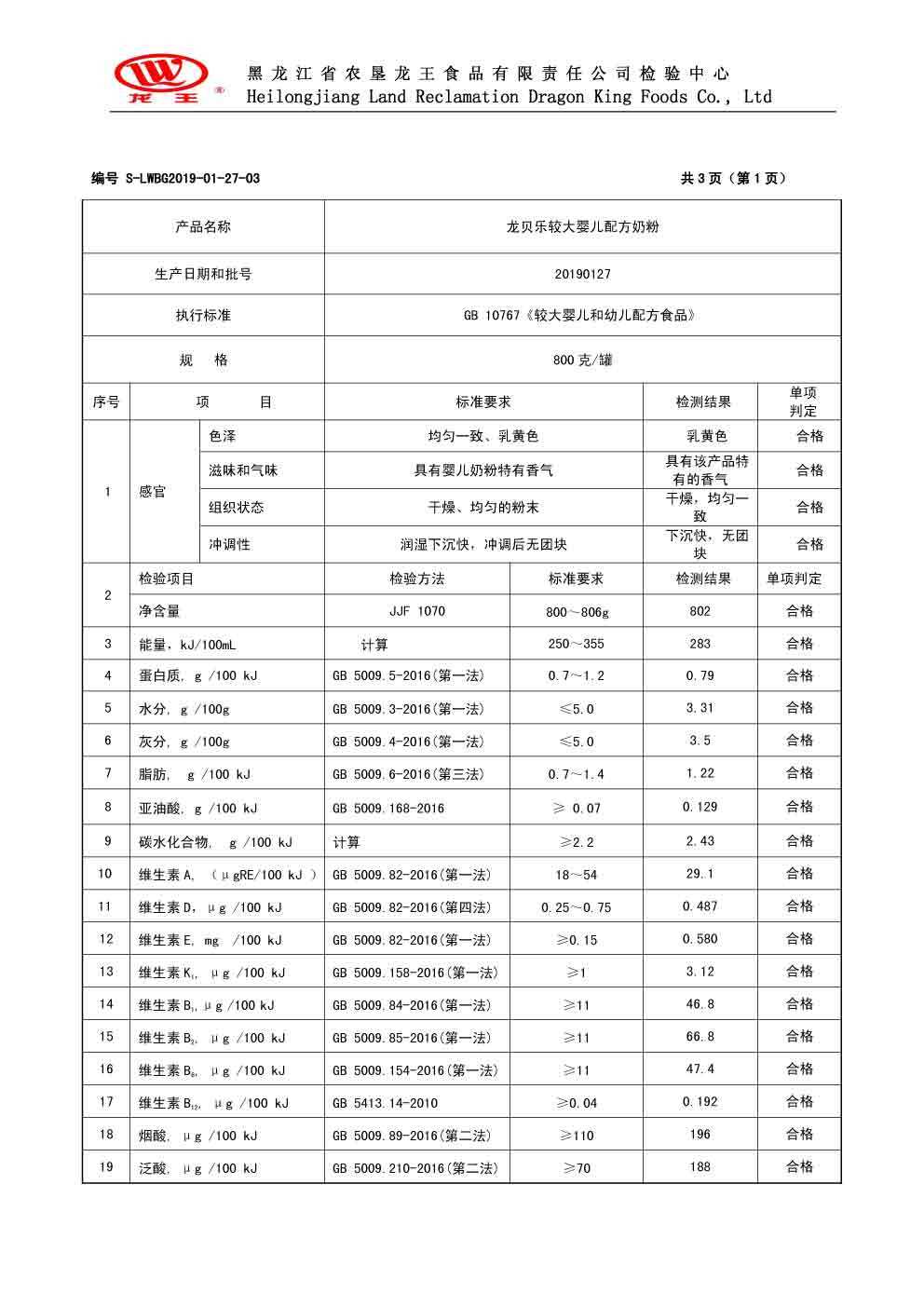 2019年(nián)01月(yuè)份龍貝樂(yuè)較大(dà)嬰兒(ér)配方奶粉800克