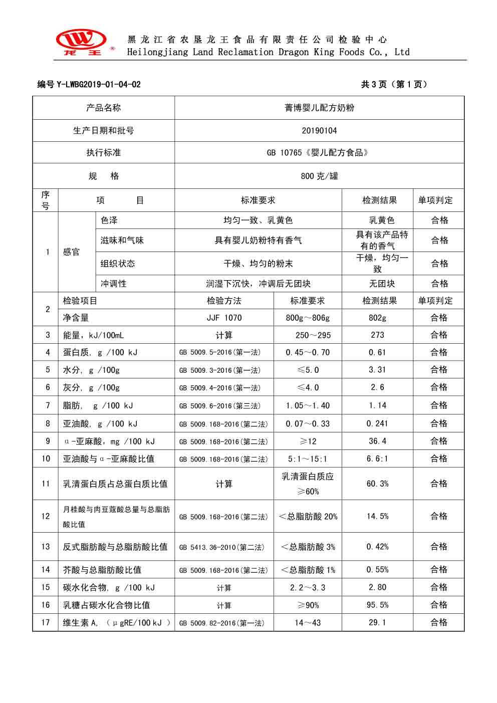2019年(nián)01月(yuè)份菁博嬰兒(ér)配方奶粉800克