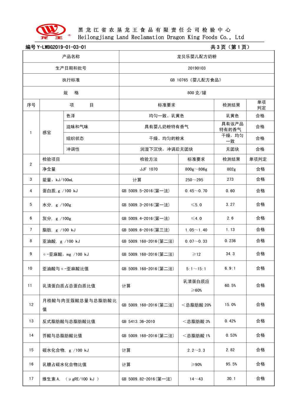 2019年(nián)01月(yuè)份龍貝樂(yuè)嬰兒(ér)配方奶粉800克
