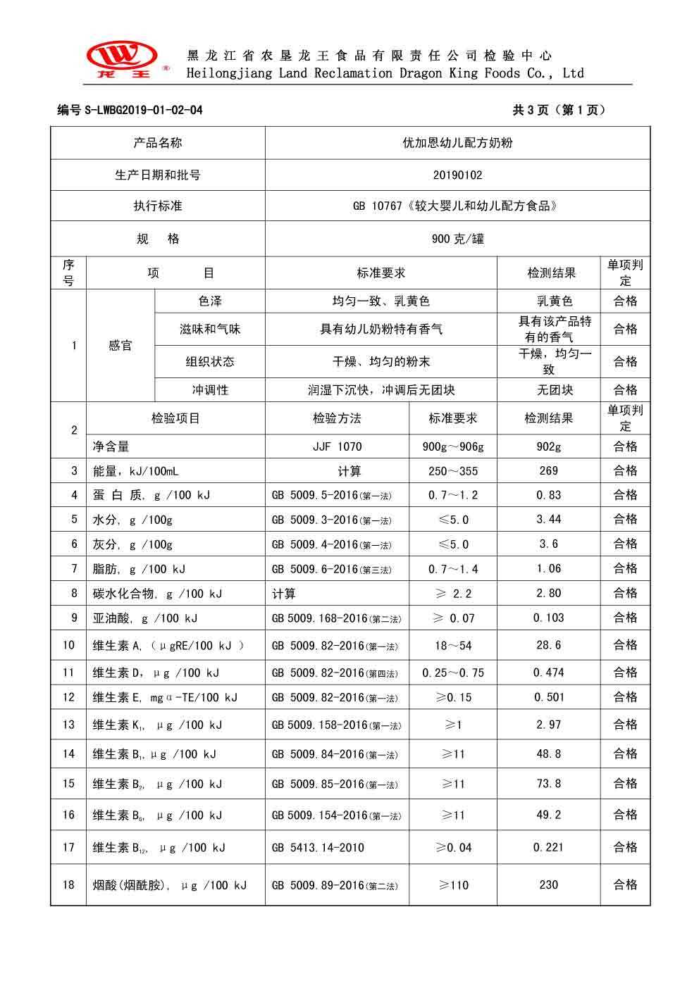 2019年(nián)01月(yuè)份優加恩幼兒(ér)配方奶粉900克