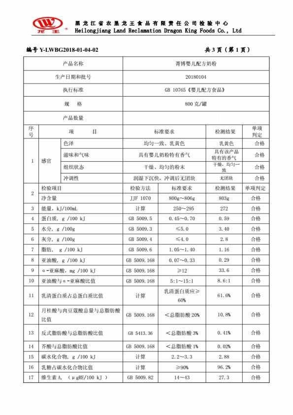 2018年(nián)01月(yuè)份菁博嬰兒(ér)配方奶粉800克