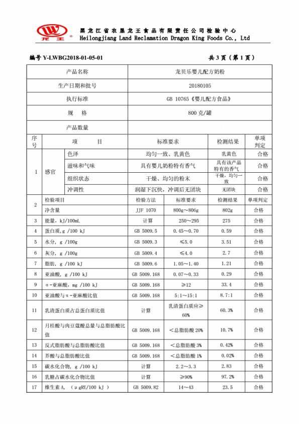 2018年(nián)01月(yuè)份龍貝樂(yuè)嬰兒(ér)配方奶粉800克