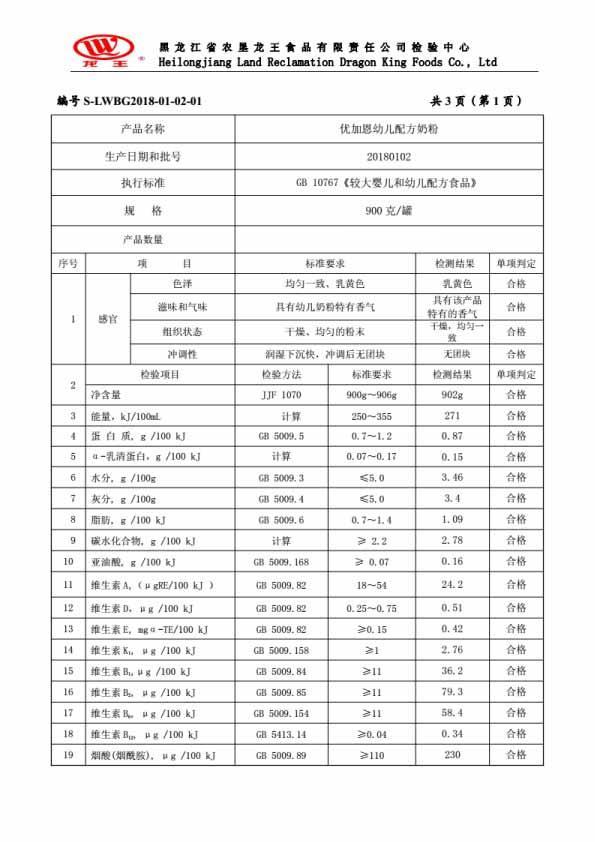 2018年(nián)01月(yuè)份優加恩幼兒(ér)配方奶粉900克